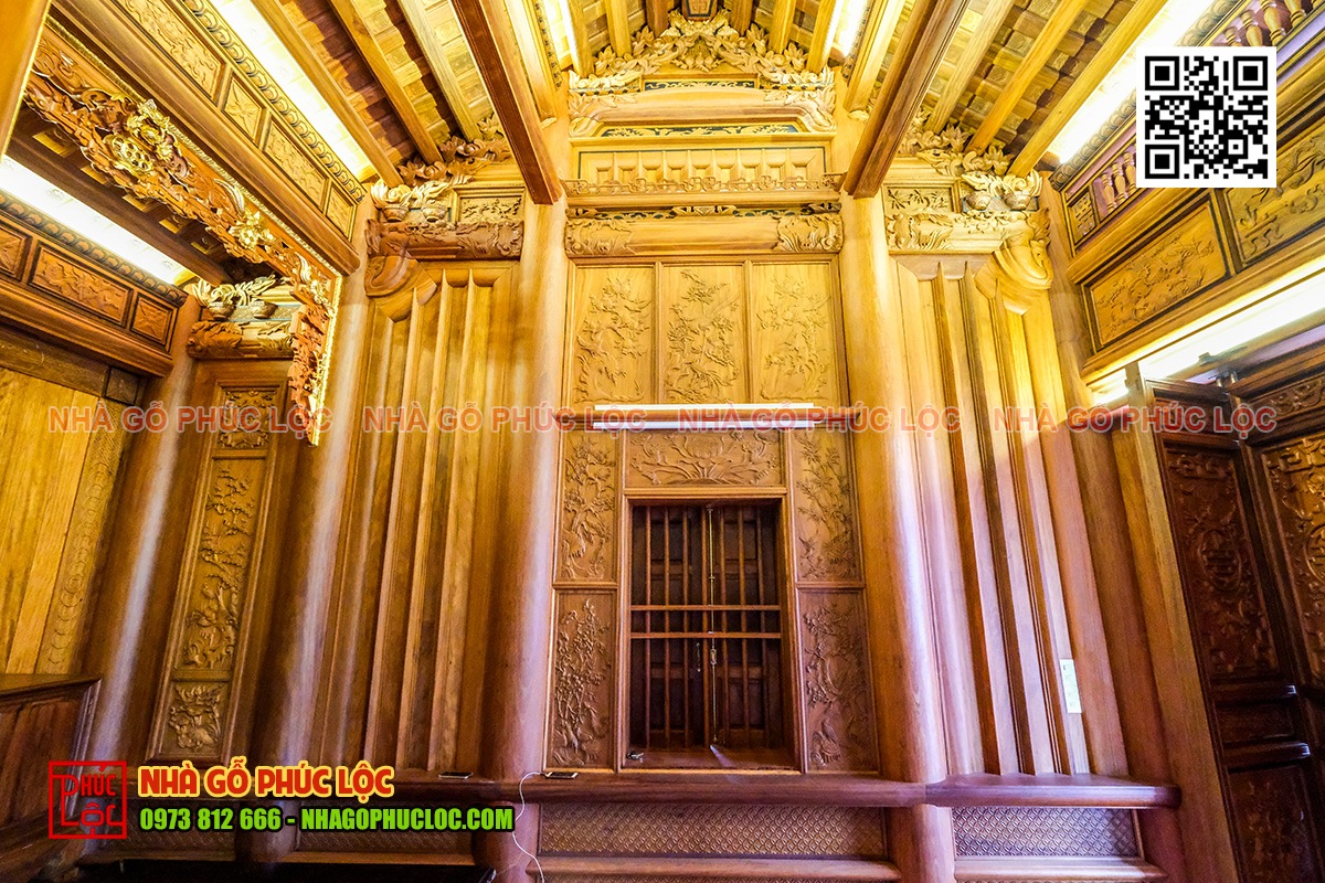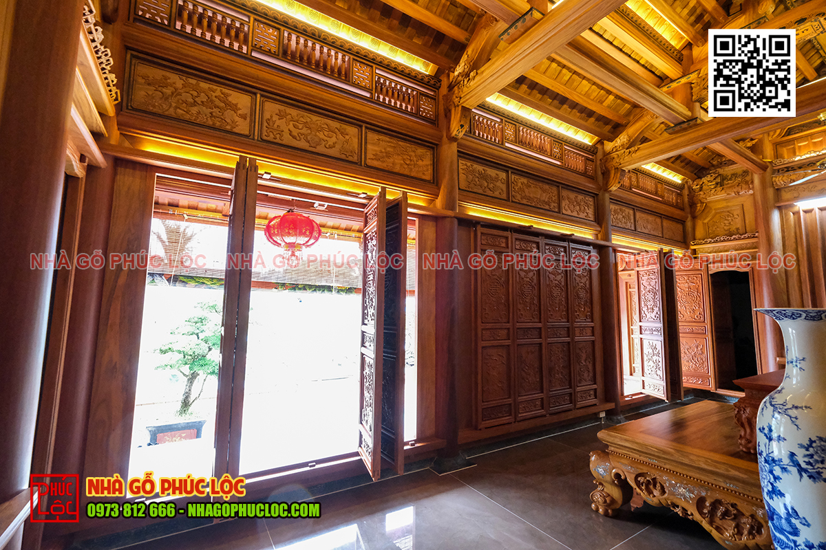 - Nội thất trong nhà gỗ cổ truyền đóng vai trò giúp căn nhà trở nên ấm cúng và hoàn thiện hơn. Đồ nội thất có thể kể đến như: sập gụ tủ chè, bộ trường kỷ, án gian, hoành phi câu đối có thể làm bằng gỗ hoặc dát vàng.