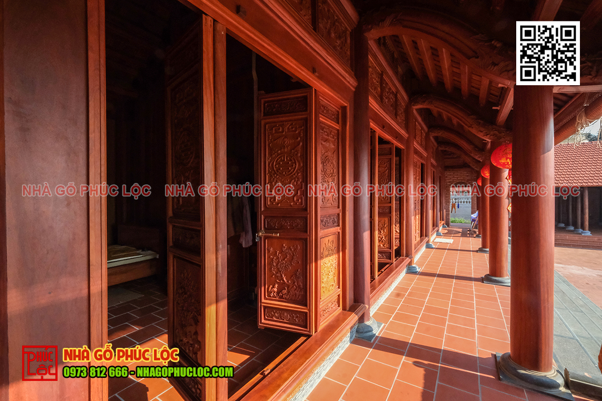 - Nhà gỗ 5 gian thông hiên: là mẫu nhà có kiến trúc giao thoa giữa những gian chính và không gian mở thông hiên, tạo ra một sự liên kết hài hòa.